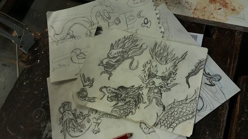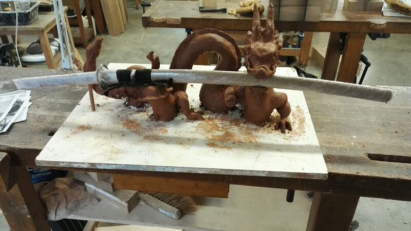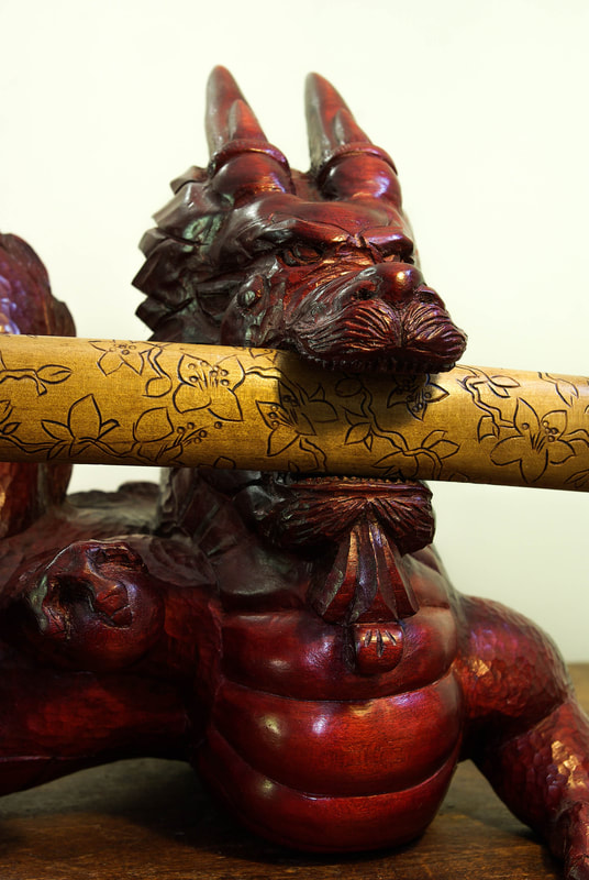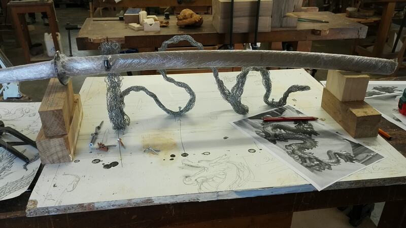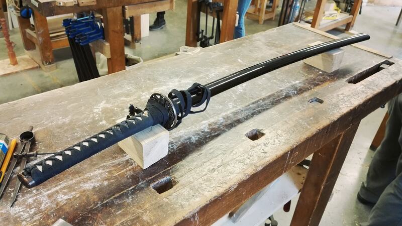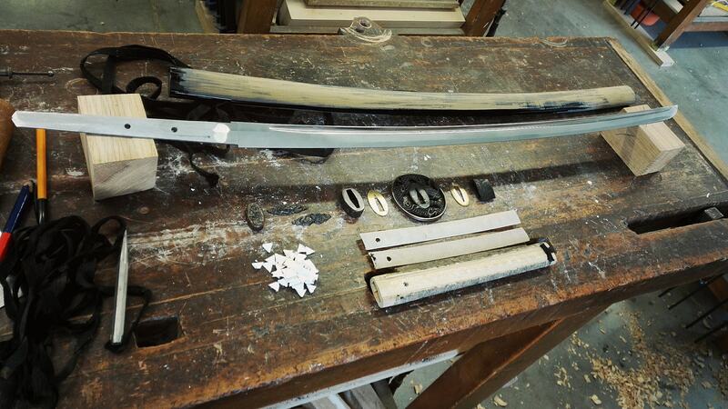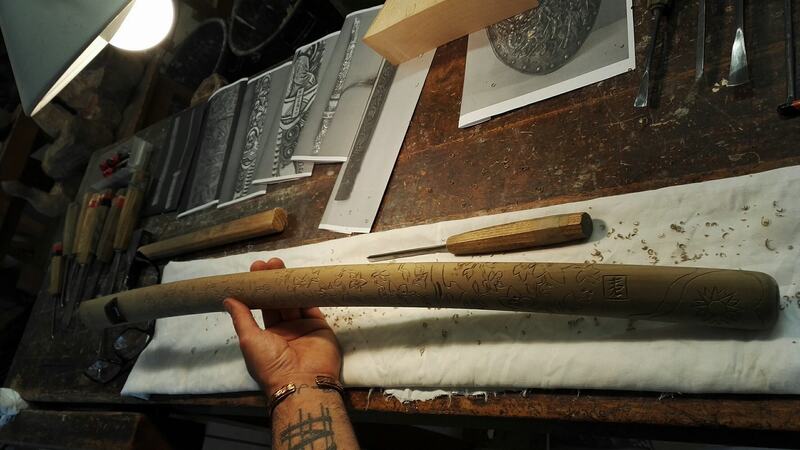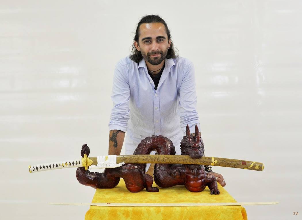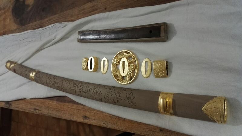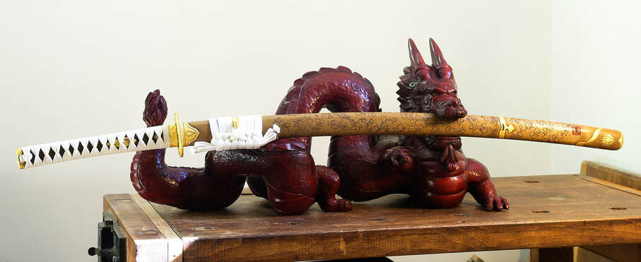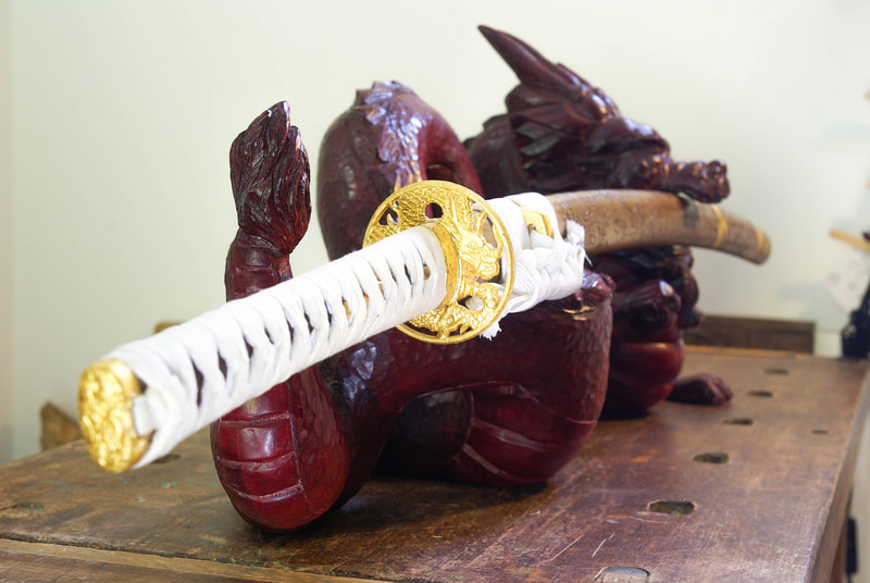 Nous sommes heureux de vous présenter un iaito Japonais, ainsi que son support, pièces uniques par Amato Rémi. Le iaito, d'origine japonaise (Minosaka) a été entièrement retravaillé par l'artiste en respectant le wabi-sabi (侘寂) par la technique du kintsugi (金継ぎ), c'est à dire au moyen de laque saupoudrée de poudre d'or. Doté d'une magnifique saya gravée main avec ferrures dorées à la feuille d'or 23'5 carats. Le sabre est accompagné d'un support (katana-kake) réalisé en noyer et sculpté à la gouge. L’œuvre a nécessité 160 heures de travail.